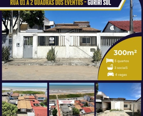 CASA À VENDA – Com 5 quartos, rua 01 à 100m da praia Guriri Sul