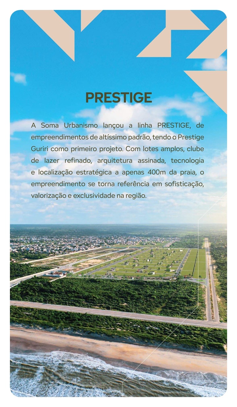O loteamento mais sofisticado e tecnológico de Guriri, será todo murado com portaria 24h, piscina de borda infinita, campo de futebol, quadra de areia, praças e área gourmet, são mais de 20 itens de lazer.